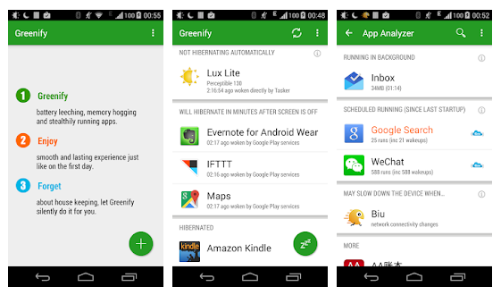 salah satu aplikasi yang wajib anda coba selain clean master adalah Greenify, kinerja dari aplikasi Greeify tidak banyak perbedaan dengan clean master di atas tadi dengan mengoptimalkan hp agar tidak menjadi lemot dan aplikasi yang berjalan tidak terpakai di keluarkan semuannya.