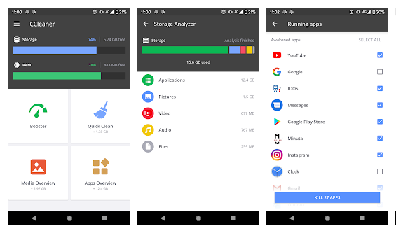 Salah satu aplikasi terbaik sampai sekarang yang bisa di gunakan diberbagai alat elektronik seperti PC, laptop dan juga hp android. Pada versi android aplikasi CCleaner tidak berbeda jauh dengan software CCleaner di PC maupun laptop. Kinerjanya yang apik membuat optimasi menjadi ringan dan refresh.